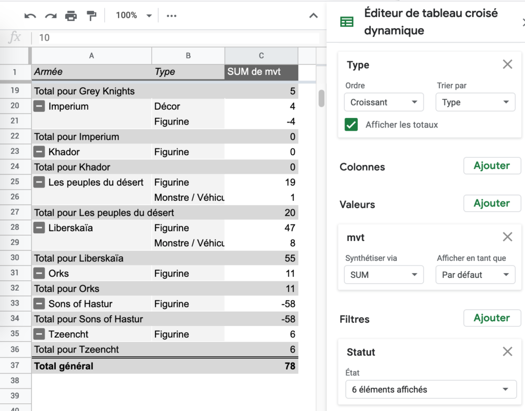 Début 2019, j’ai donc mis en place un suivi de mes travaux. Par déformation professionnelle, plutôt que compter tout ce que j’avais en stock, j’ai préféré suivre le flux qui alimente le stock. Dans un premier temps, l’objectif étant de limiter l’augmentation du stock. Pour cela, tout au long de l’année, je tiens à jour un fichier sur Google Spreadsheet avec tout les mouvements dans mon stock global de figurines.