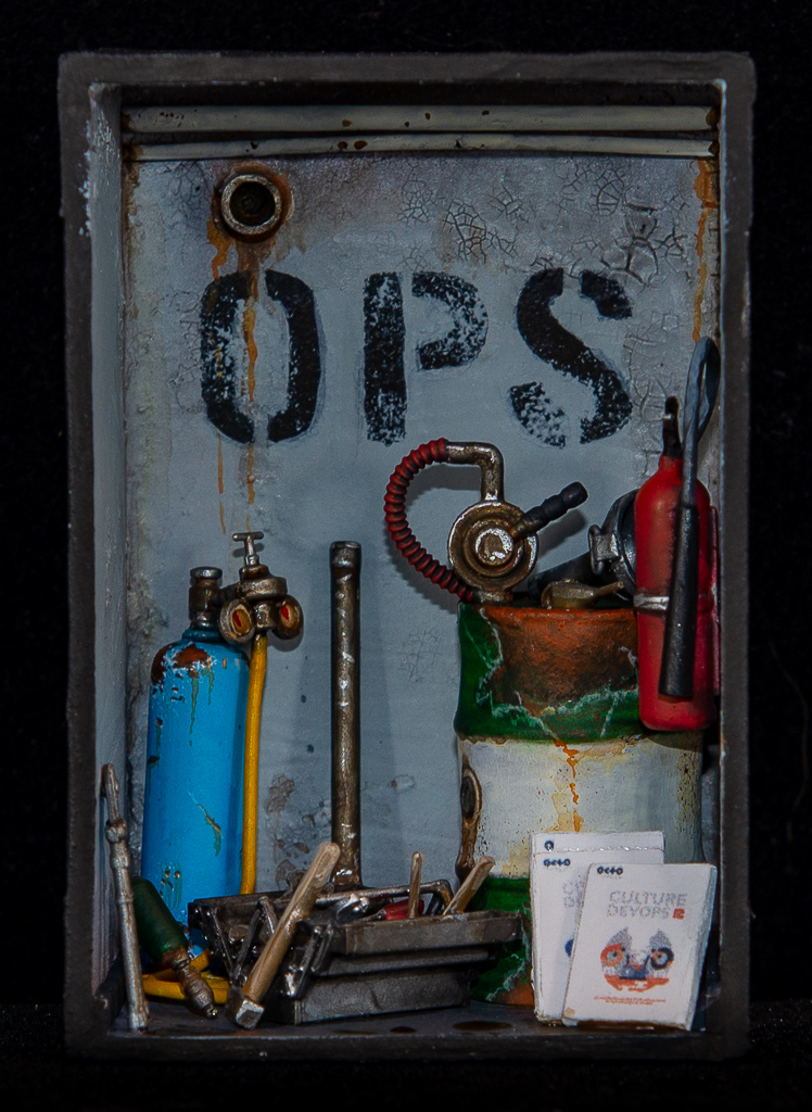 Après quelques réflexions et en farfouillant dans ma boîte à rabiots, j’ai décidé de lui faire une sorte de cagibi avec le nom de l’équipe dont il est responsable au boulot, et des outils en référence à son logo d’équipe. Et c’était l’occasion de travailler de l’usure et la rouille…
