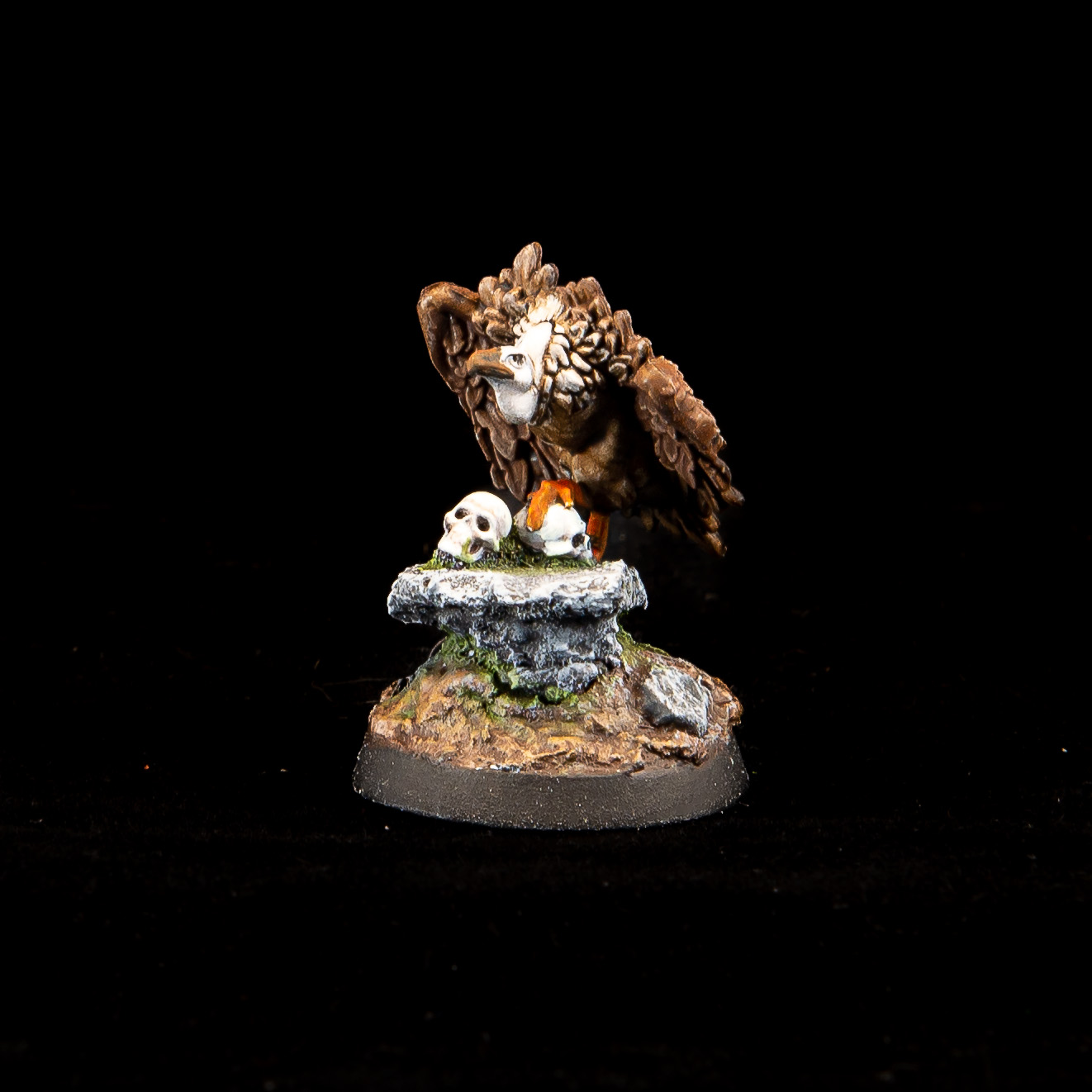 Encore un projet terminé. Ici, il s’agit d’un vautour que j’ai extrait d’un élément de décors Dungeons & Lasers de la boîte Land of the Giants. D’une part je n’aime pas trop avoir de bestioles sur les éléments de décor (même si j’ai laissé un vautour sur la mâchoire, ce dernier il semblait trop difficile à enlever), d’autre part, j’ai trouvé une entrée vautour dans le bestiaire d’un des nombreux jeux que j’ai en stock (Rangers of Shadow Deep, Sellswords & Spellslinger, etc.).