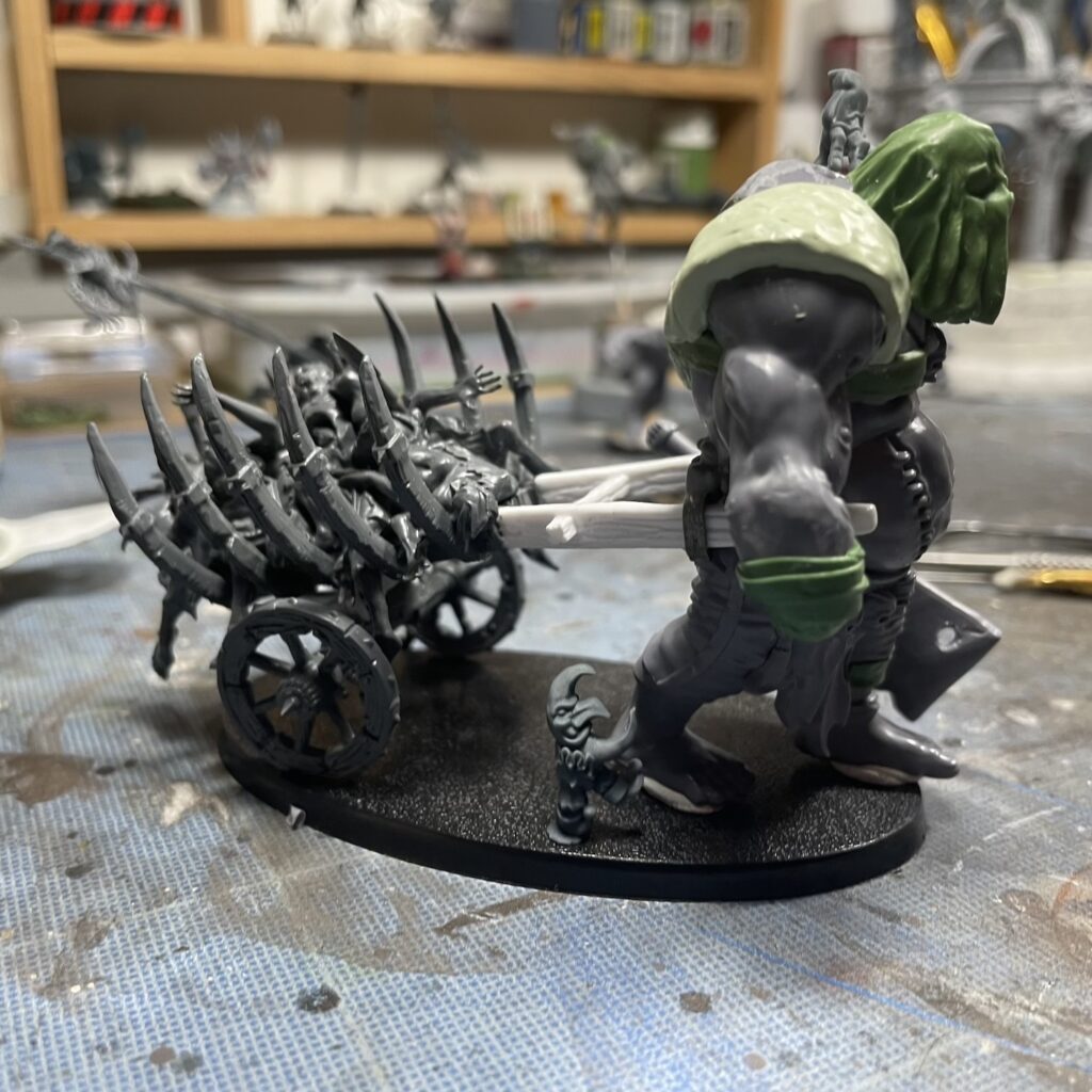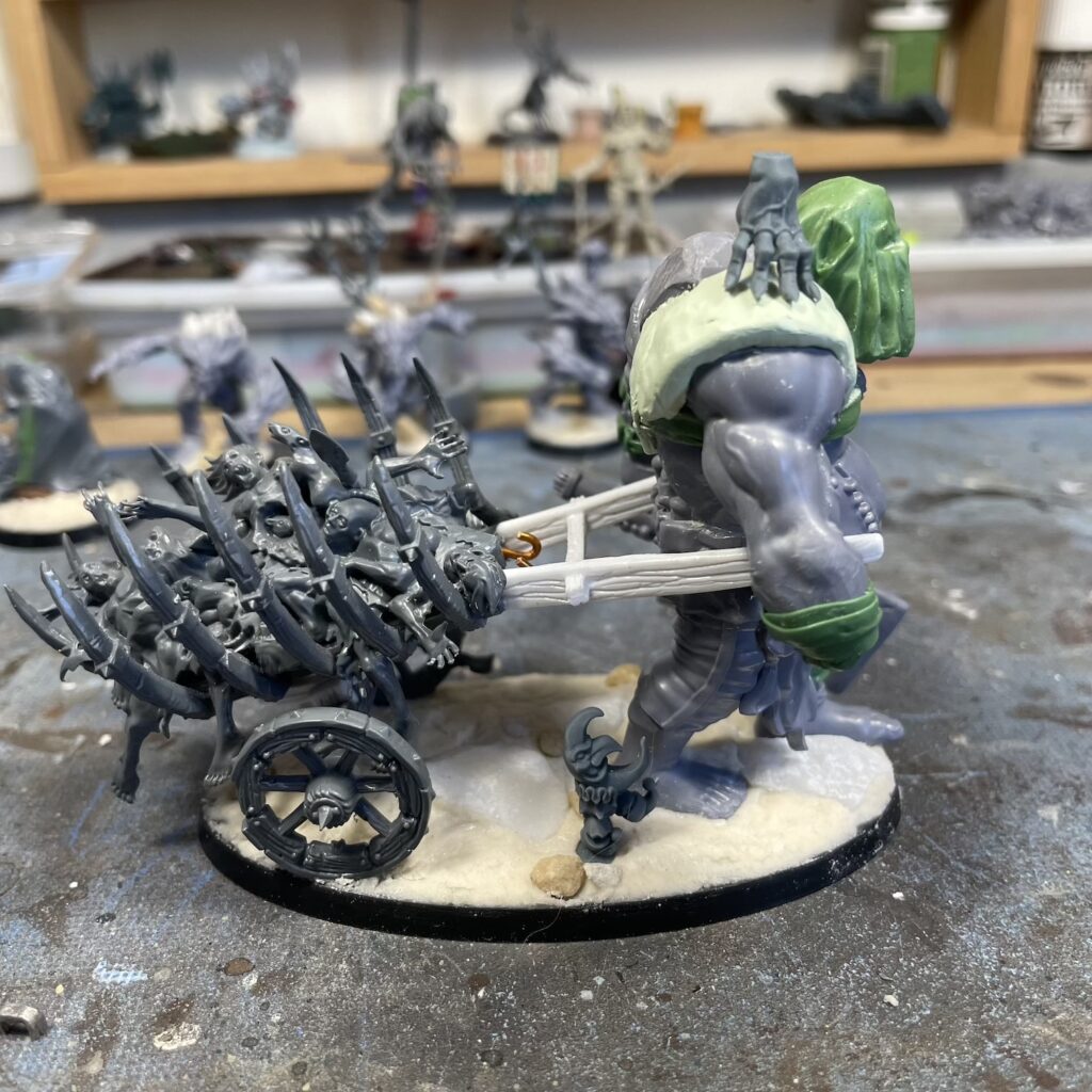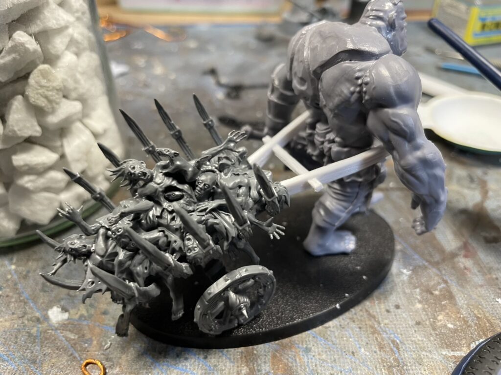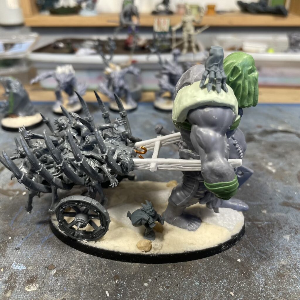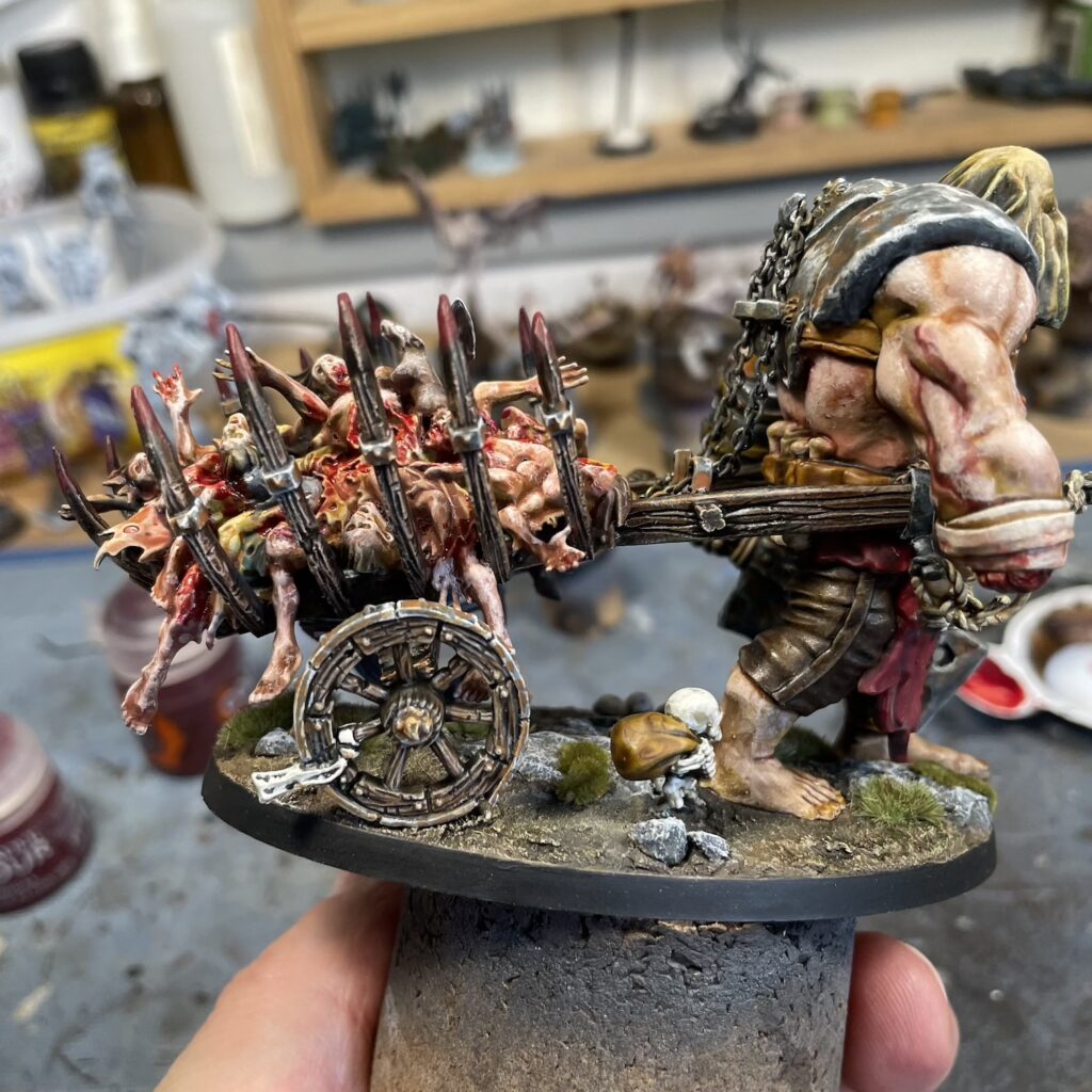 Pour accentuer le côté collection de cadavre, j’avais le kit de chariot macabre de chez Citadel initialement prévu pour un autre projet, éternellement reporté. L’occasion était donnée de le monter et de tester comment l’intégrer avec l’ogre.