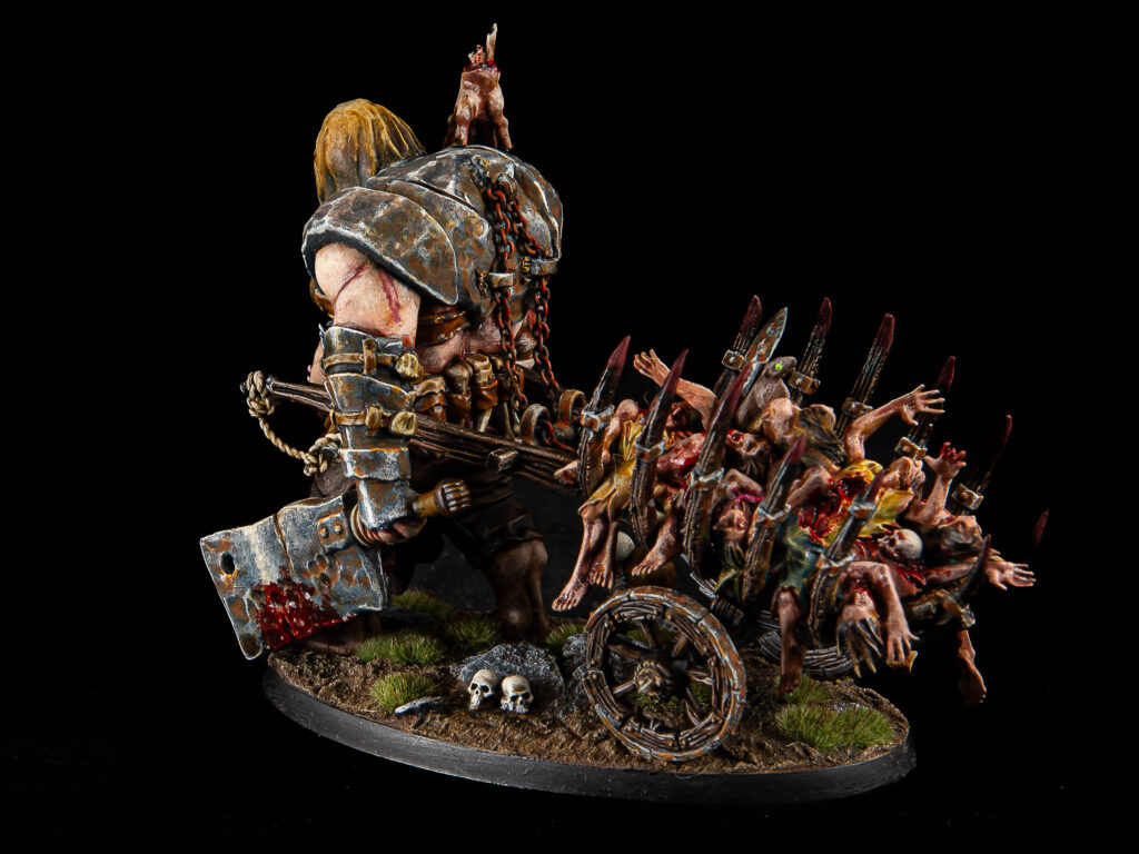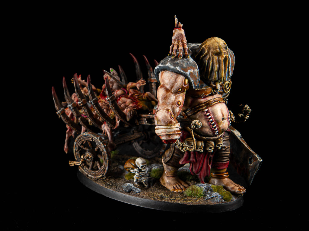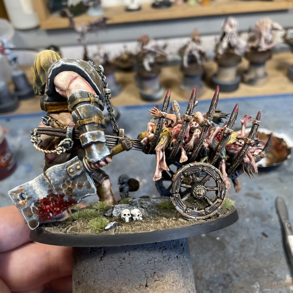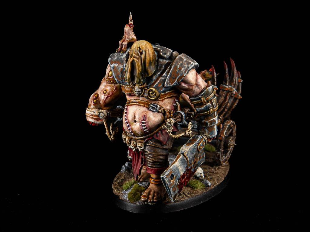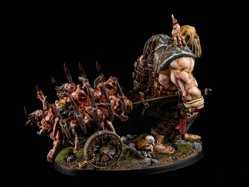 Pour accentuer le côté collection de cadavre, j’avais le kit de chariot macabre de chez Citadel initialement prévu pour un autre projet, éternellement reporté. L’occasion était donnée de le monter et de tester comment l’intégrer avec l’ogre.