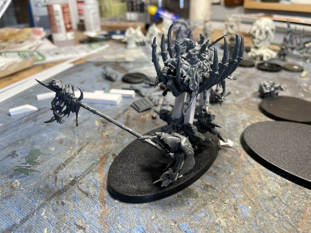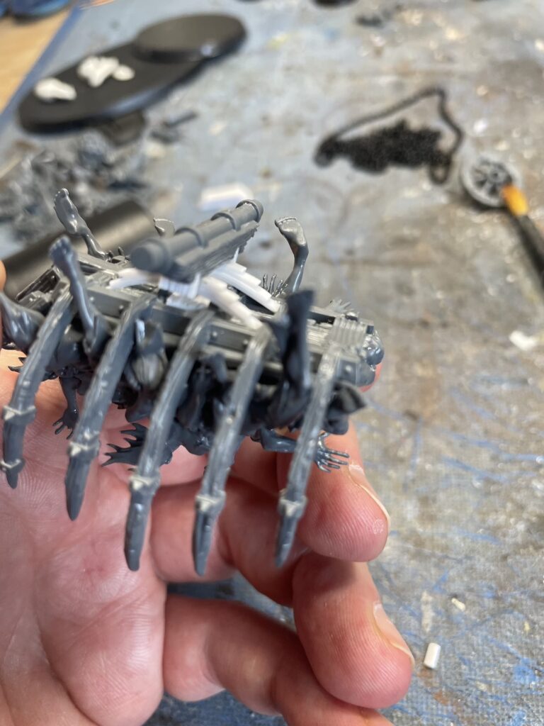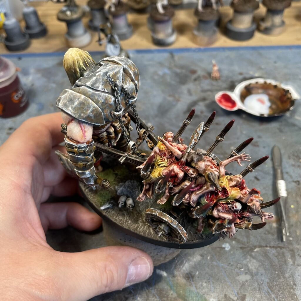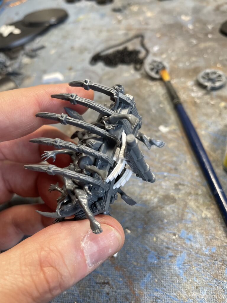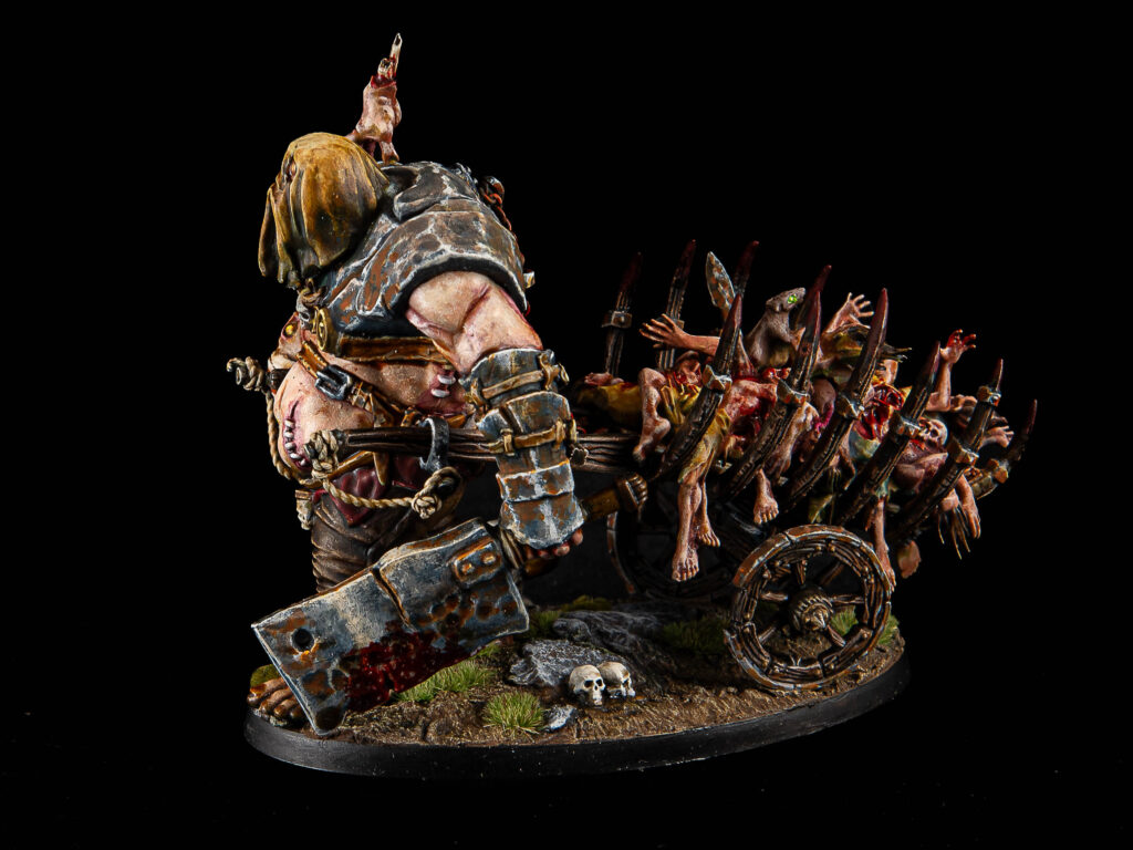 Pour accentuer le côté collection de cadavre, j’avais le kit de chariot macabre de chez Citadel initialement prévu pour un autre projet, éternellement reporté. L’occasion était donnée de le monter et de tester comment l’intégrer avec l’ogre.