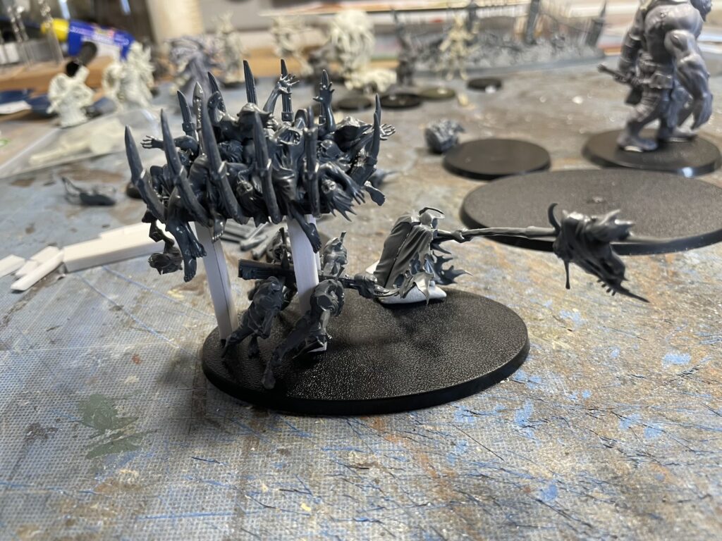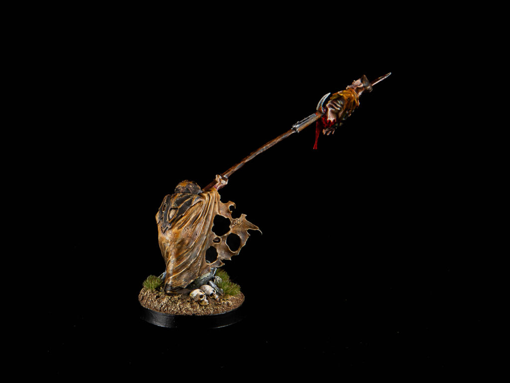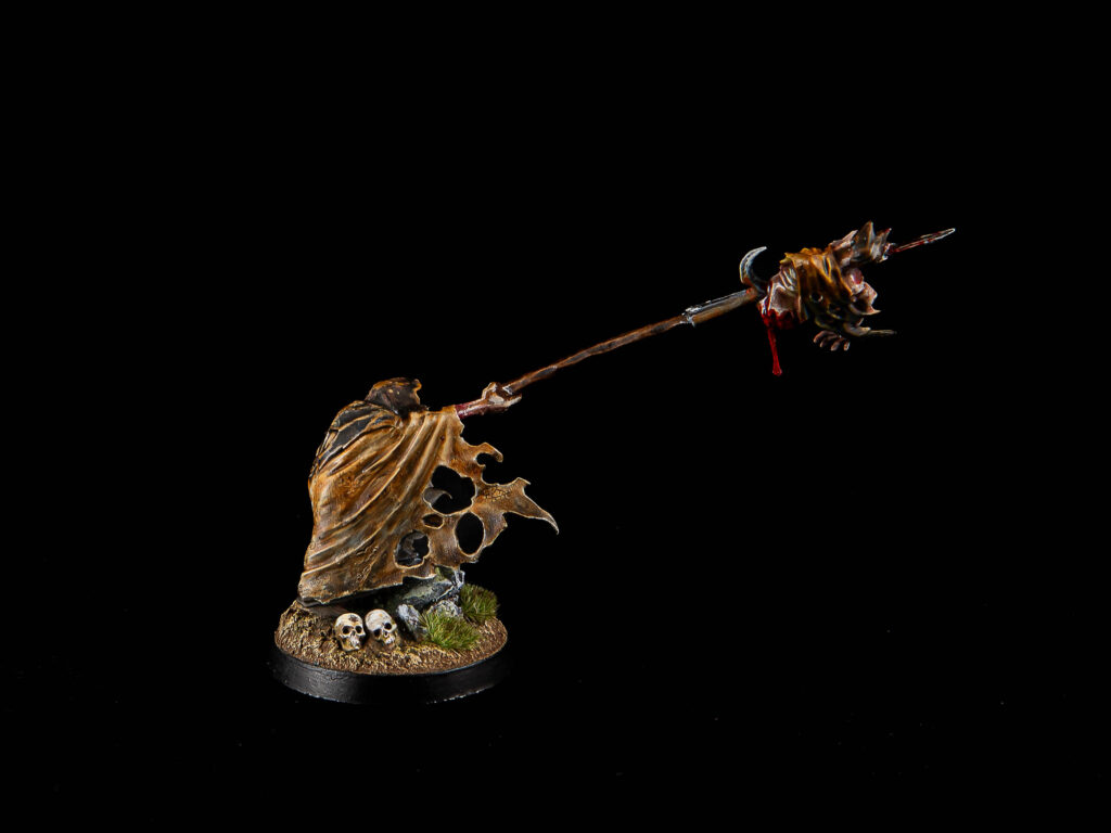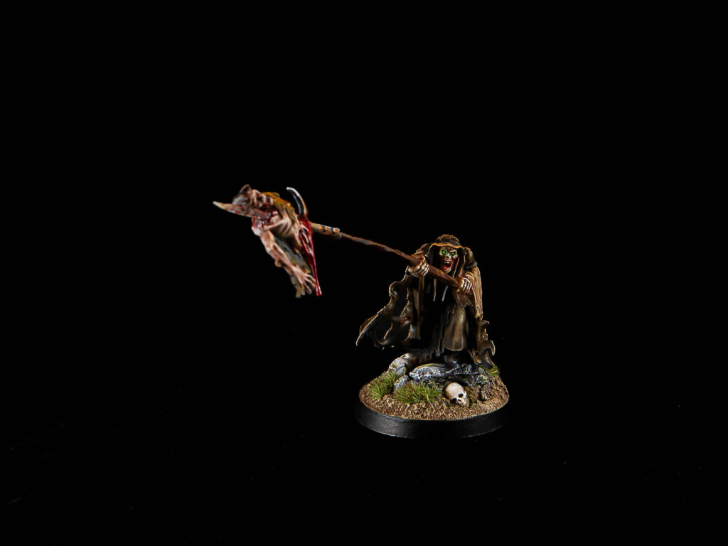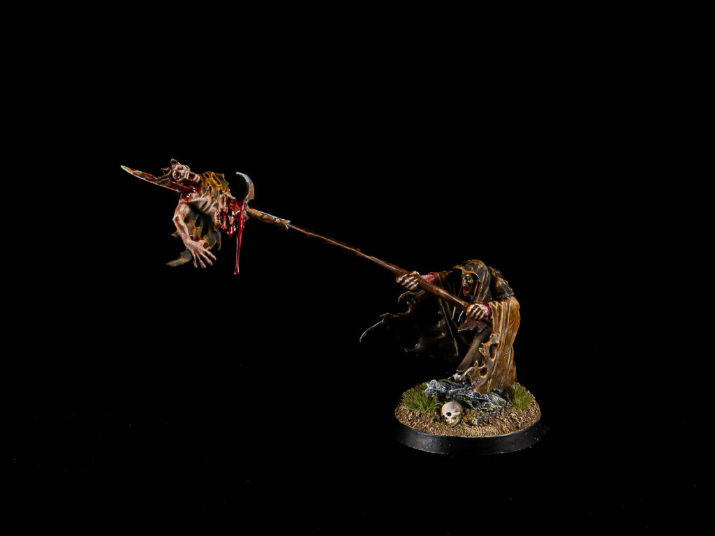 Cependant, j’avais toujours la figurine de nécromancien du kit Citadel qui me plaisait beaucoup… et finalement, si ce n’était pas lui le vrai moissonneur ? J’en ai donc profité pour le monter, avec l’option « collecteur » et le peindre. Les deux figurines se complètent bien.