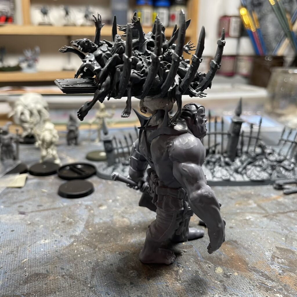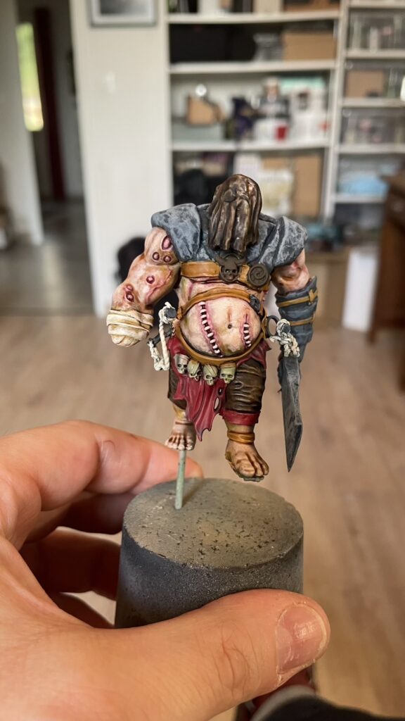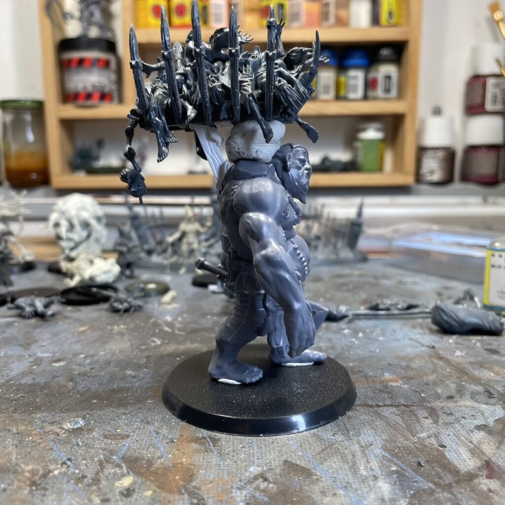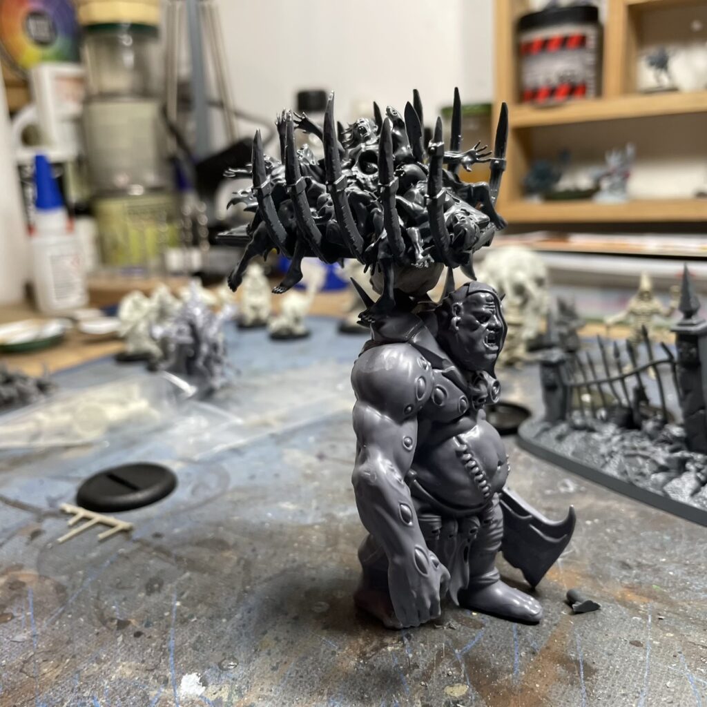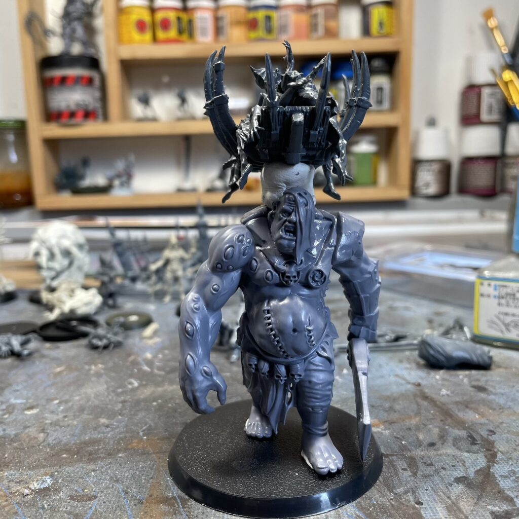 Et voici la grosse pièce nécessaire pour le premier scénario : le moissonneur de cadavres. Pour cette figurine, je souhaitais faire une conversion, et j’avais une figurine idéale pour ça, une sorte de gros ogre de chez Archon Studio.