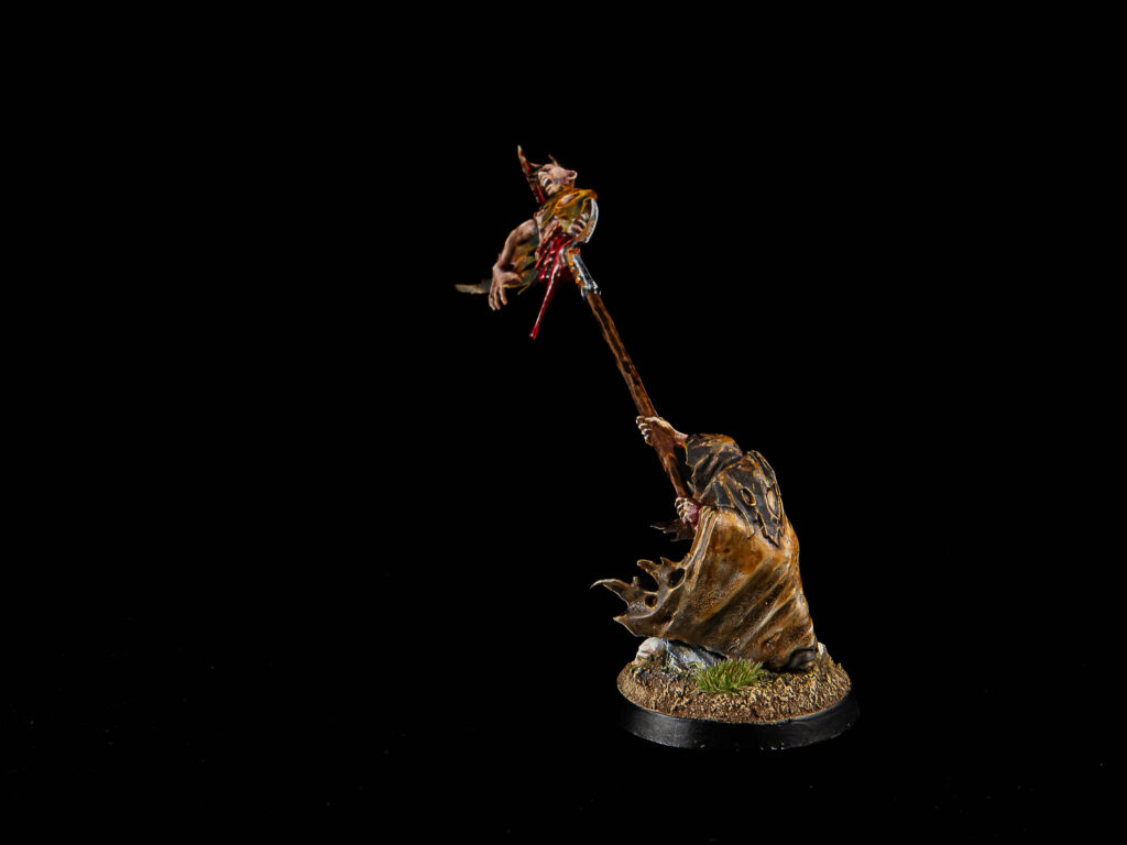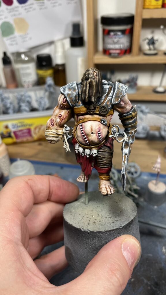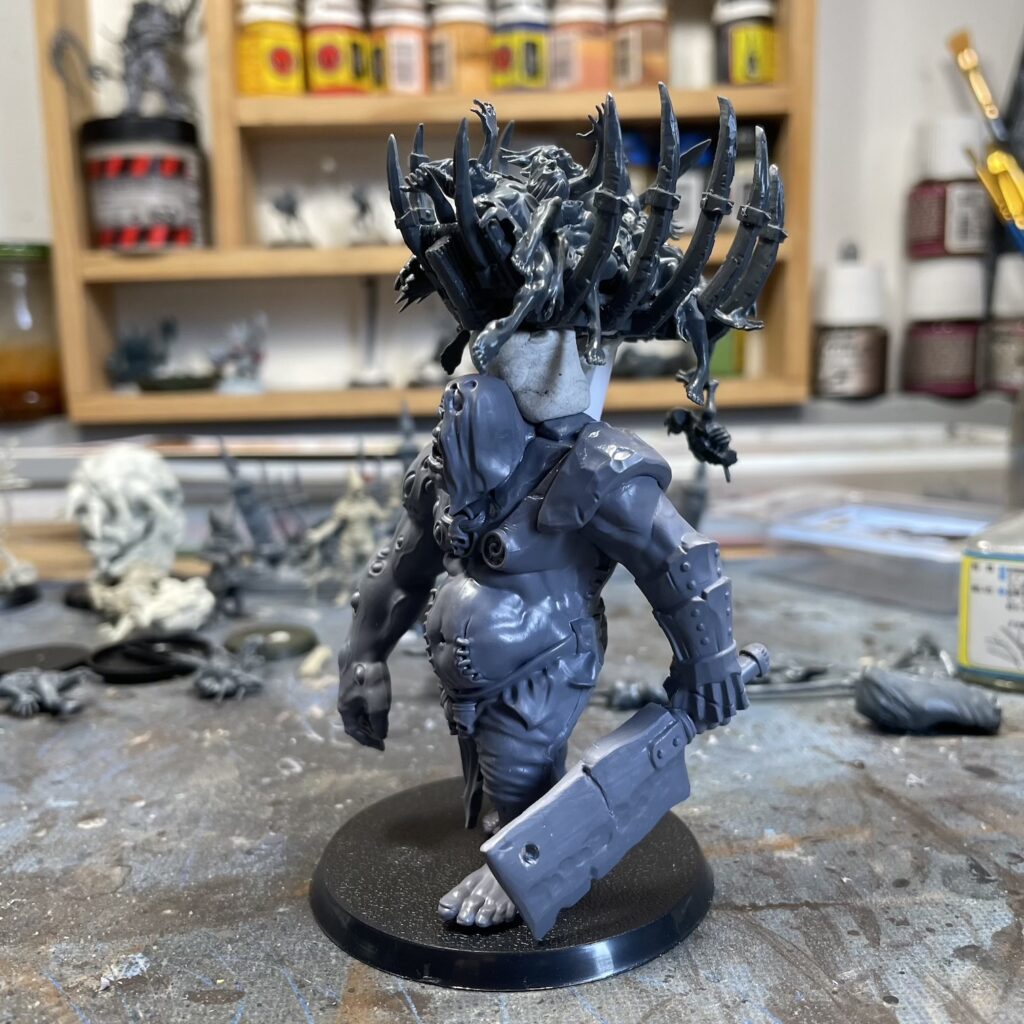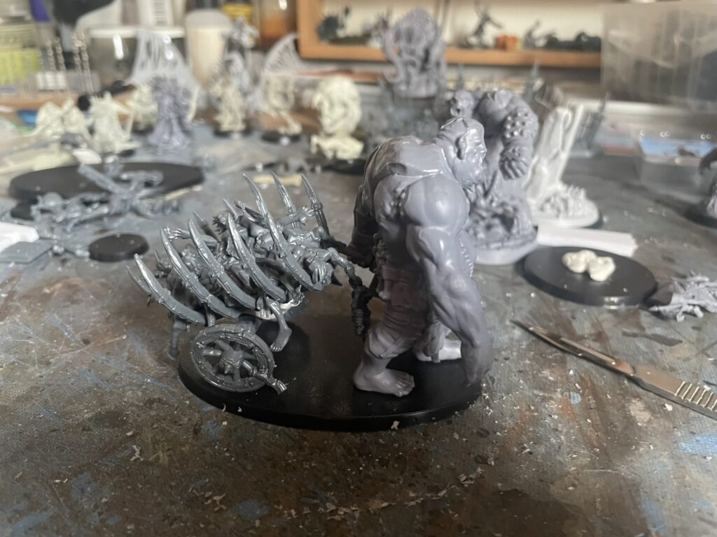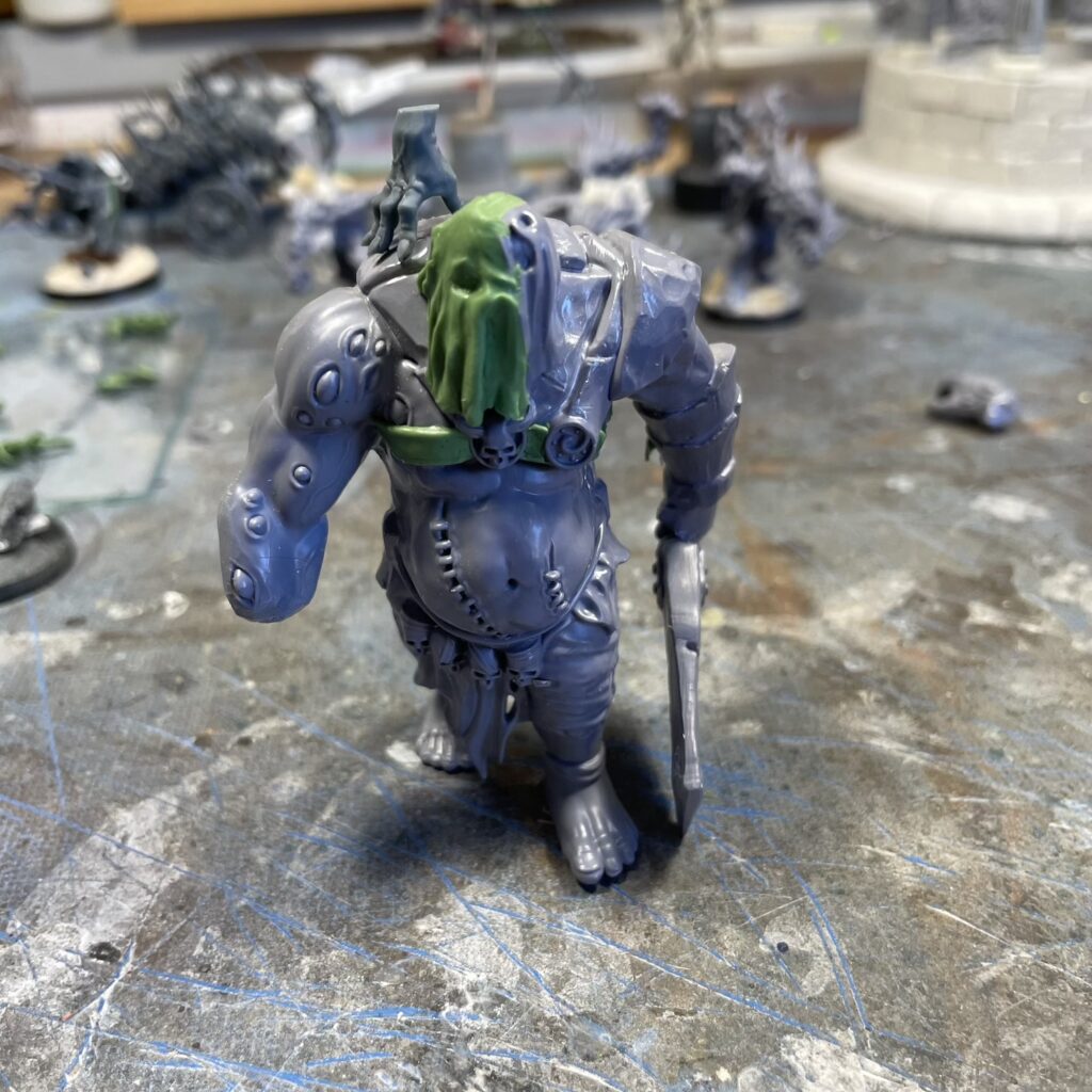 Et voici la grosse pièce nécessaire pour le premier scénario : le moissonneur de cadavres. Pour cette figurine, je souhaitais faire une conversion, et j’avais une figurine idéale pour ça, une sorte de gros ogre de chez Archon Studio.