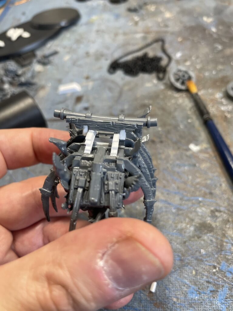 Et pour terminer la conversion, j’ai ajouté des crochets sur les pièces d’armure comme sur le chariot pour pouvoir faire passer la chaîne de tractage.