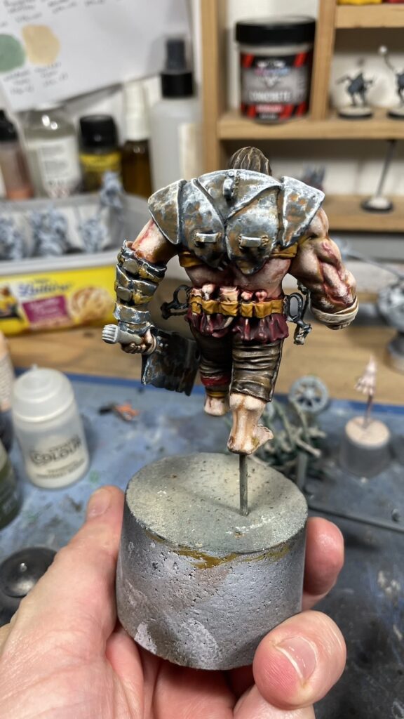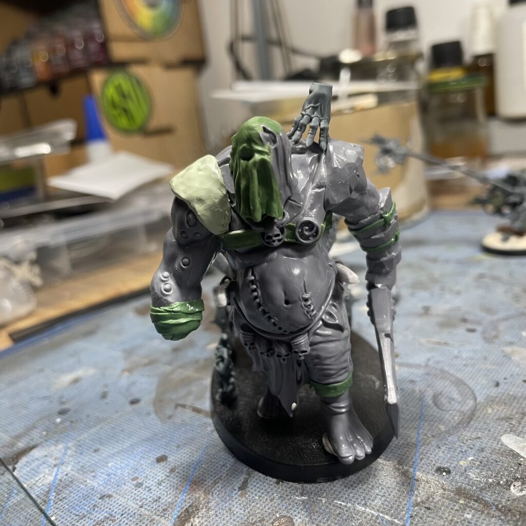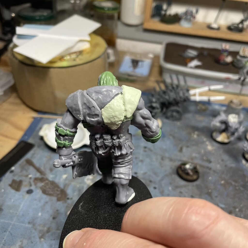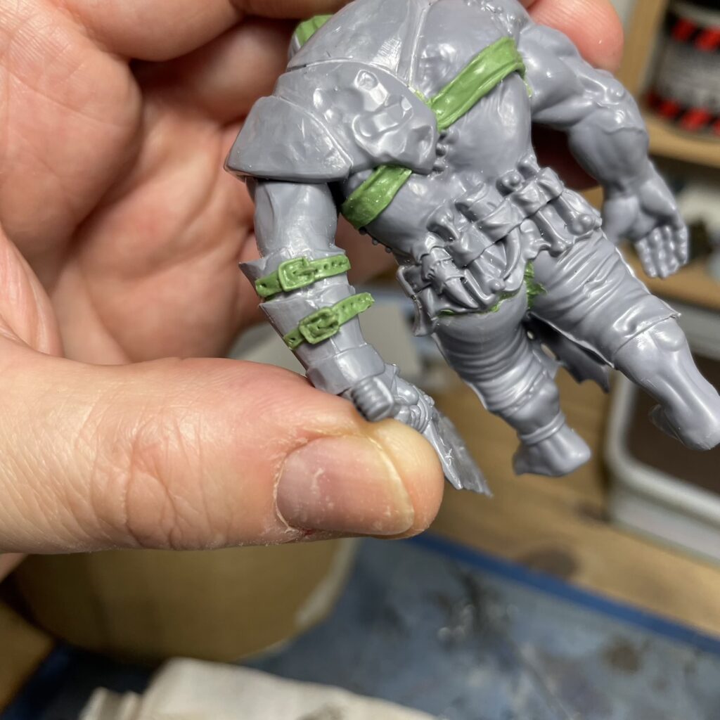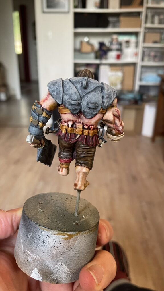 Il s’agissait maintenant de convertir un peu la figurine d’ogre pour qu’elle ressemble plus à ce que j’avais en tête, notamment le rendre plus tangible. Pour commencer, j’ai ajouté des lanières de cuir ici et là pour « attacher » les différents éléments d’armures. J’ai aussi complété la cagoule pour masquer cette tête qui ne me plaisait pas vraiment. Tout ça à la greenstuff.
