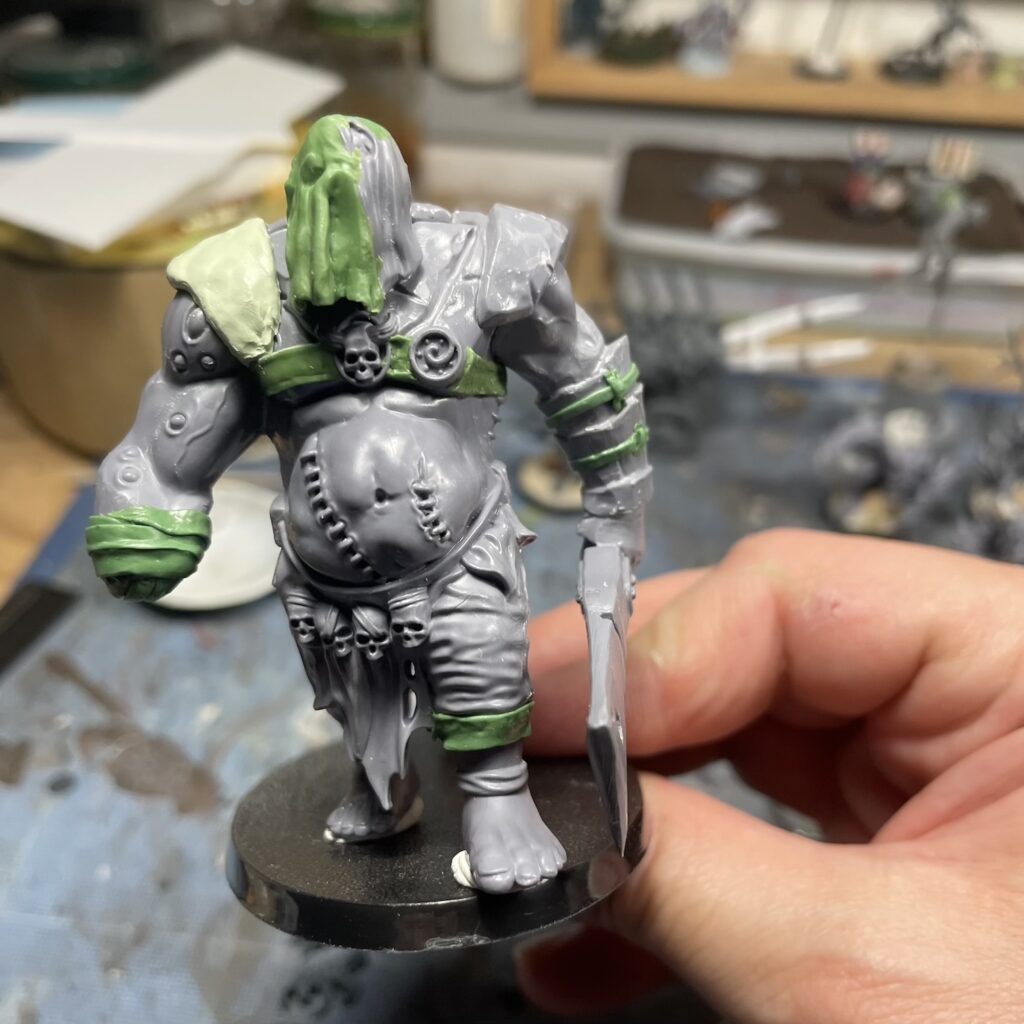 J’ai ensuite ajouté des pièces d’armures symétriques aux plaques existantes, en mélange de greenstuff et milliput. Et pour terminer (temporairement) la conversion, j’ai coupé la main droite et fait un bandage grossier. J’avais en stock un « familier main » (issu du KS helpers de MOM Miniatures). J’adore ce genre de familier qui fait inévitablement penser à la Chose.