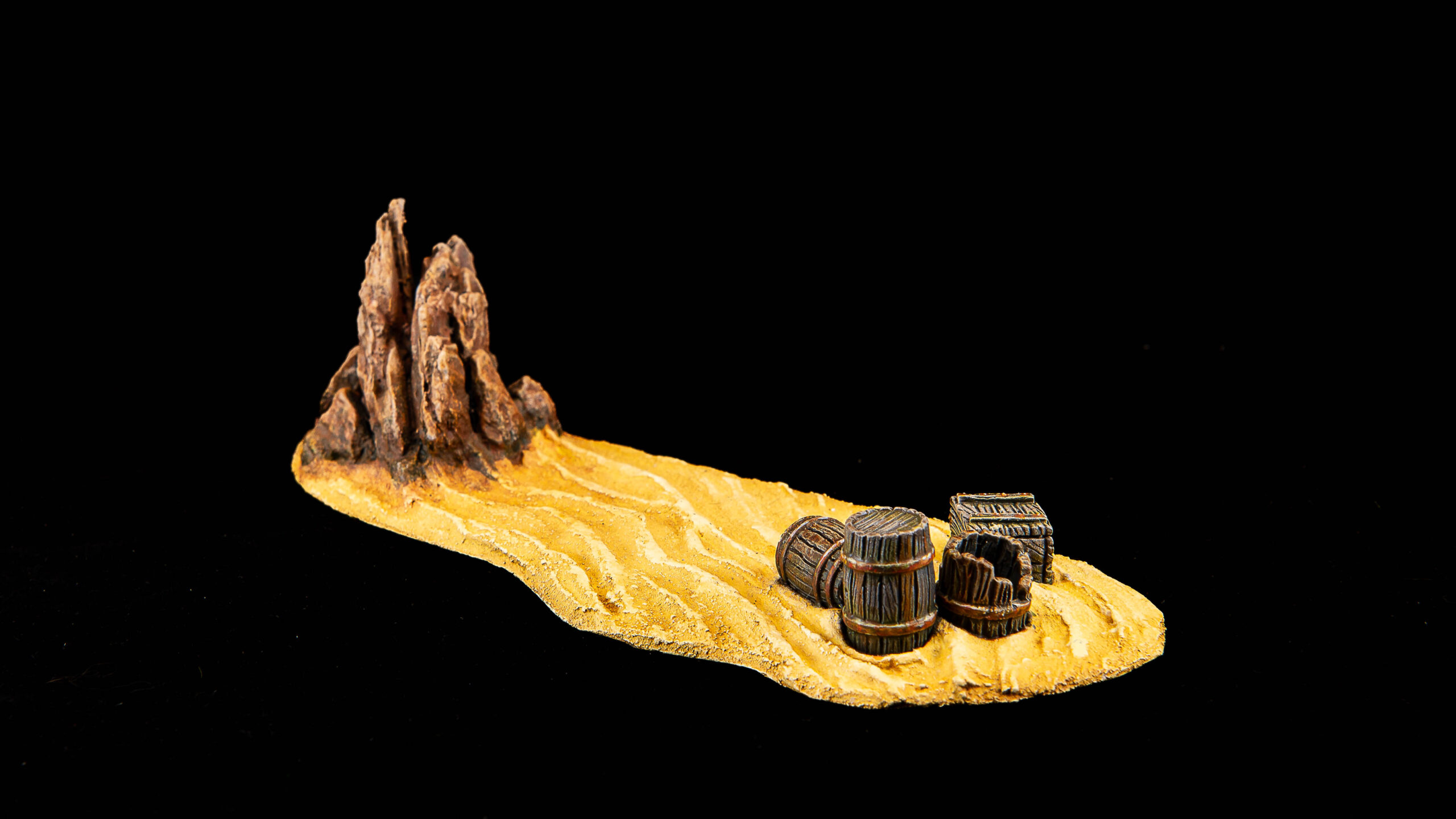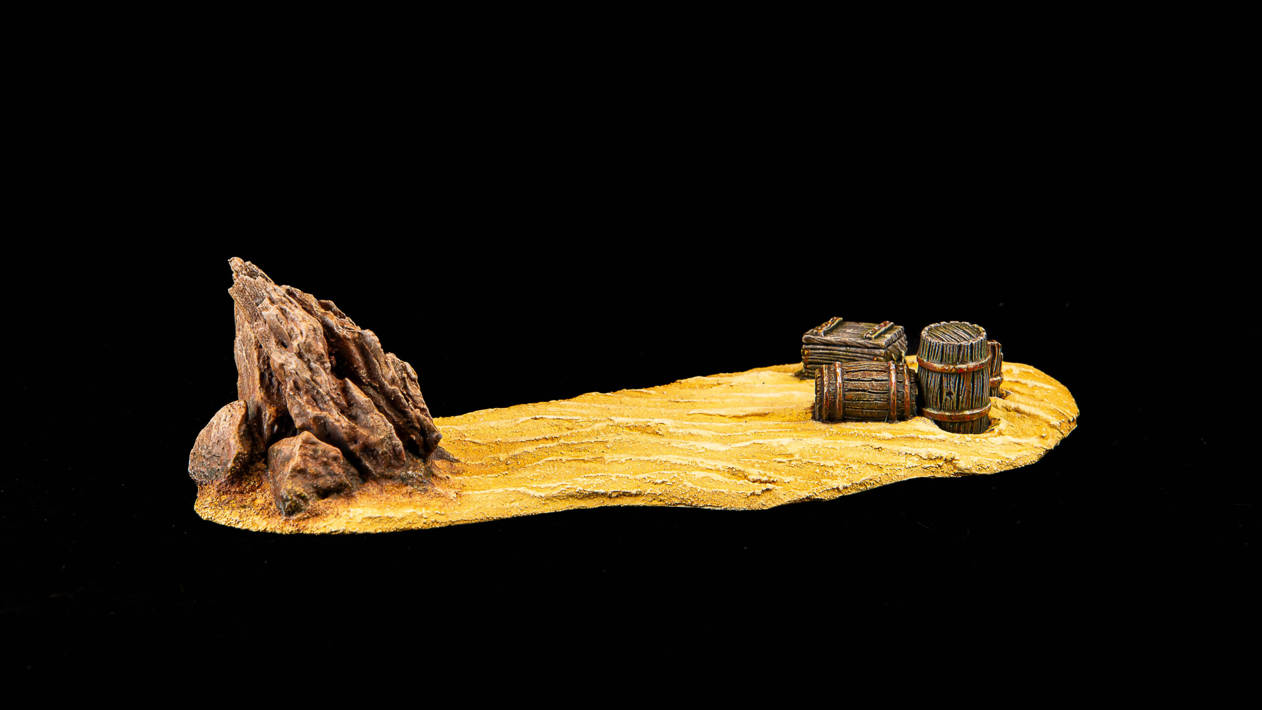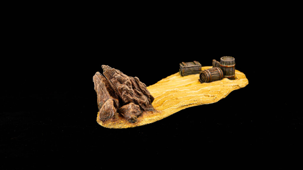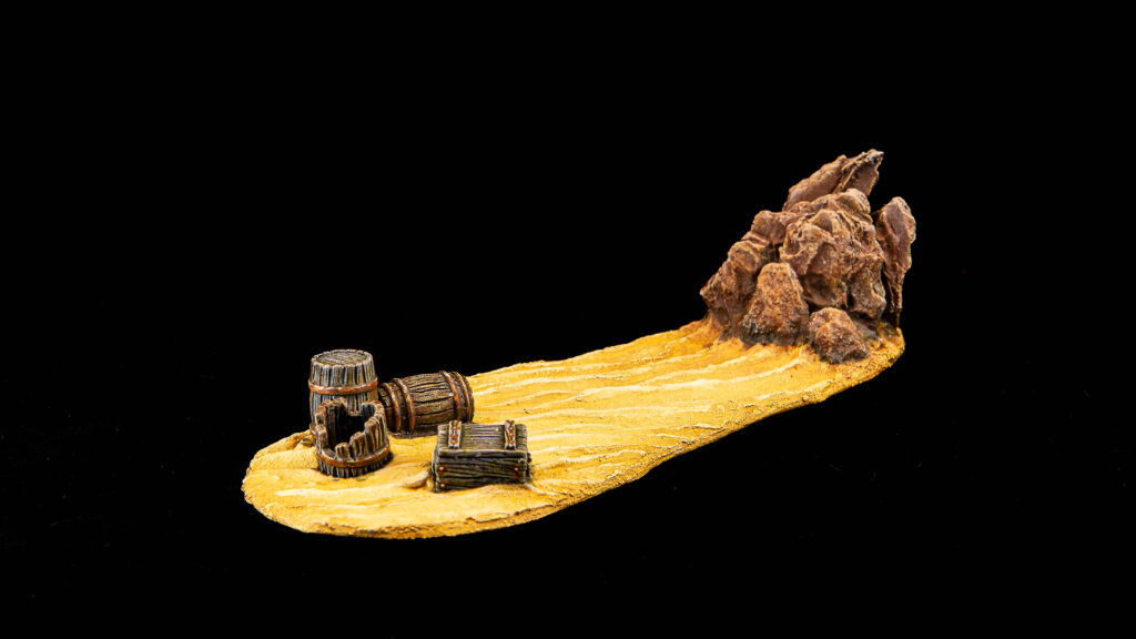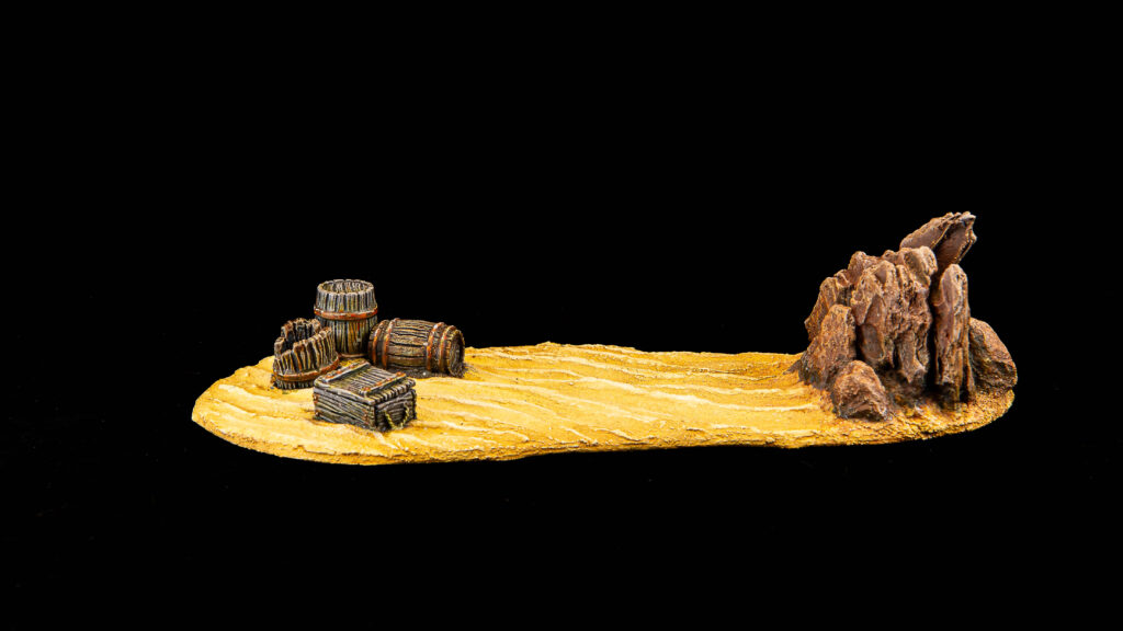 Quant aux tonneaux et autres caisses, j’ai simplement fait quelques brossages à sec gris sur une base marron foncée, puis un lavis d’Agrax Earthshade. Les métaux étant peints en divers tons de rouille (marron foncé + orange) relevé de quelques points gris clairs.