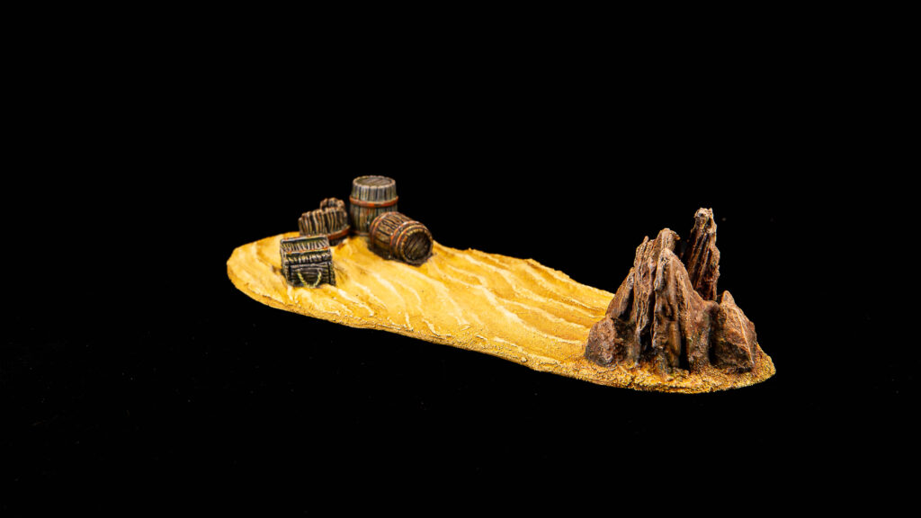 Pour ce fameux troisième scénario de Forbidden Psalm, j’avais besoin de faire une table spécifique avec une plage. Afin de tester la technique envisagée pour le sable et les schémas de couleurs à utiliser, j’ai fait un petit élément de décor sur un bout de MDF, quelques morceaux d’écorces et des bits de tonneau que j’avais en stock.