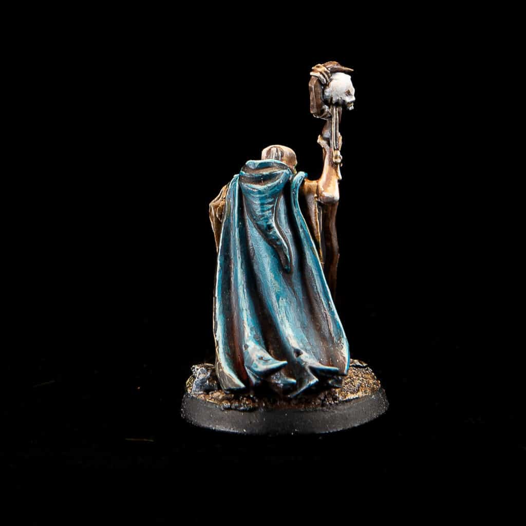 Tout comme le précédent, la figurine est finement détaillée, tout en restant simple dans sa conception et sans trop de détails, ce qui facilite la peinture. Comme une partie de mes squelettes, j’ai utilisé un bleu bien marqué pour la cape. Pour le reste, j’ai laissé venir la peinture avec ce que j’avais sur la palette à ce moment là, une pratique de peinture qui me convient de mieux en mieux.