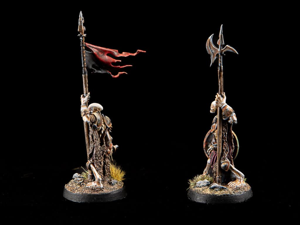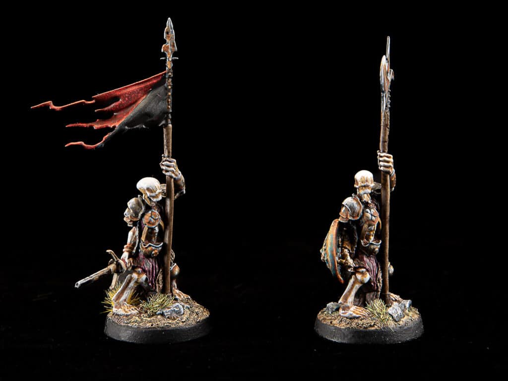 Afin d’accompagner ce nécromancien, j’ai eu une grosse inspiration à convertir ces deux gardes sur la même base de porte bannière (une vieille référence du jeu Celtos). J’avais déjà le porte bannière sur cette base.