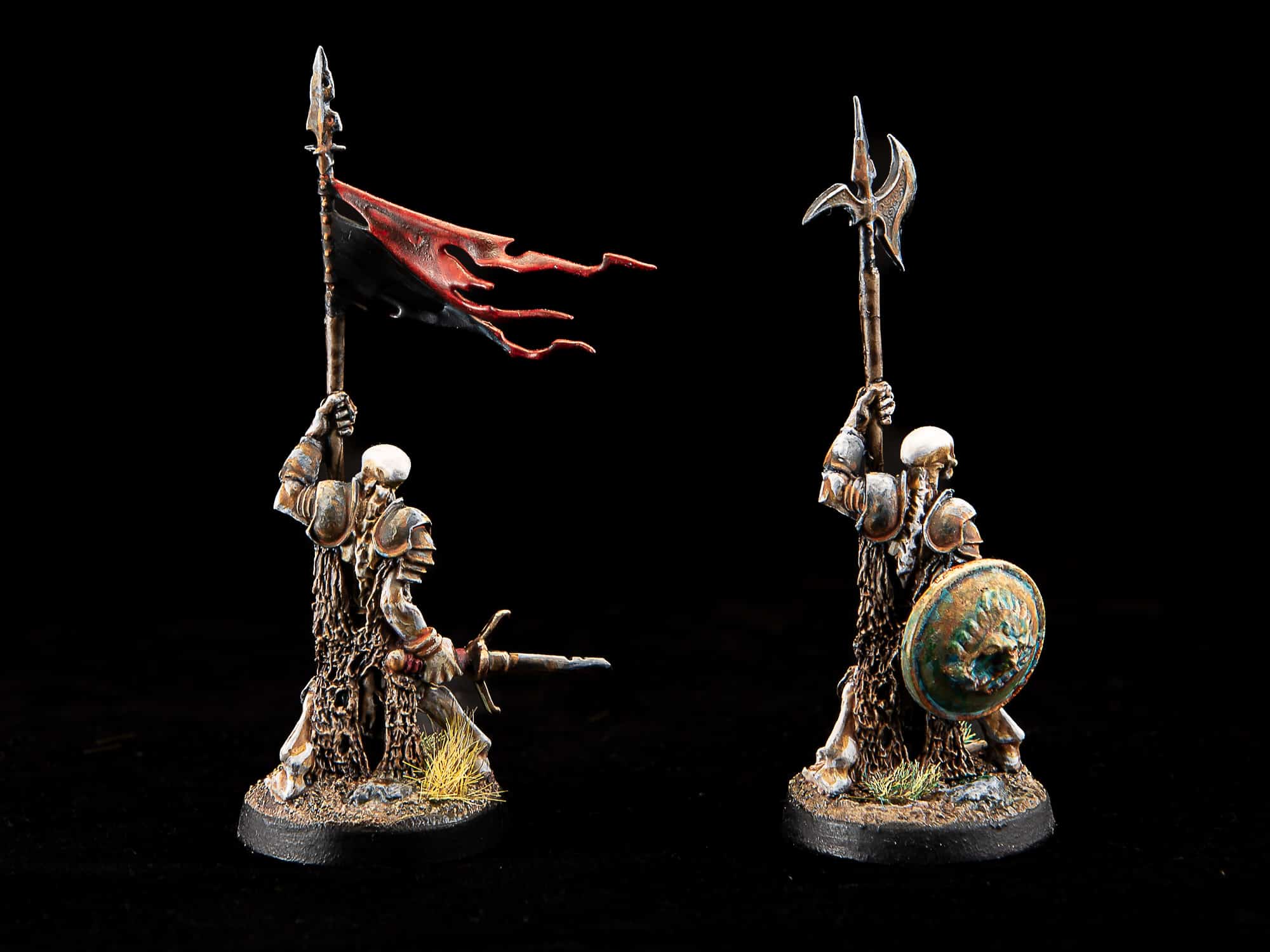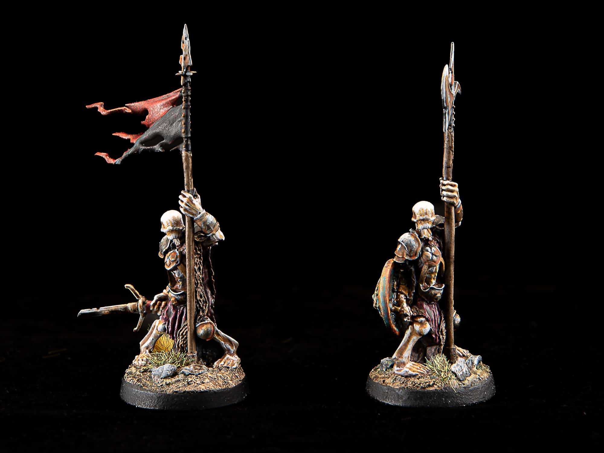 Afin d’accompagner ce nécromancien, j’ai eu une grosse inspiration à convertir ces deux gardes sur la même base de porte bannière (une vieille référence du jeu Celtos). J’avais déjà le porte bannière sur cette base.