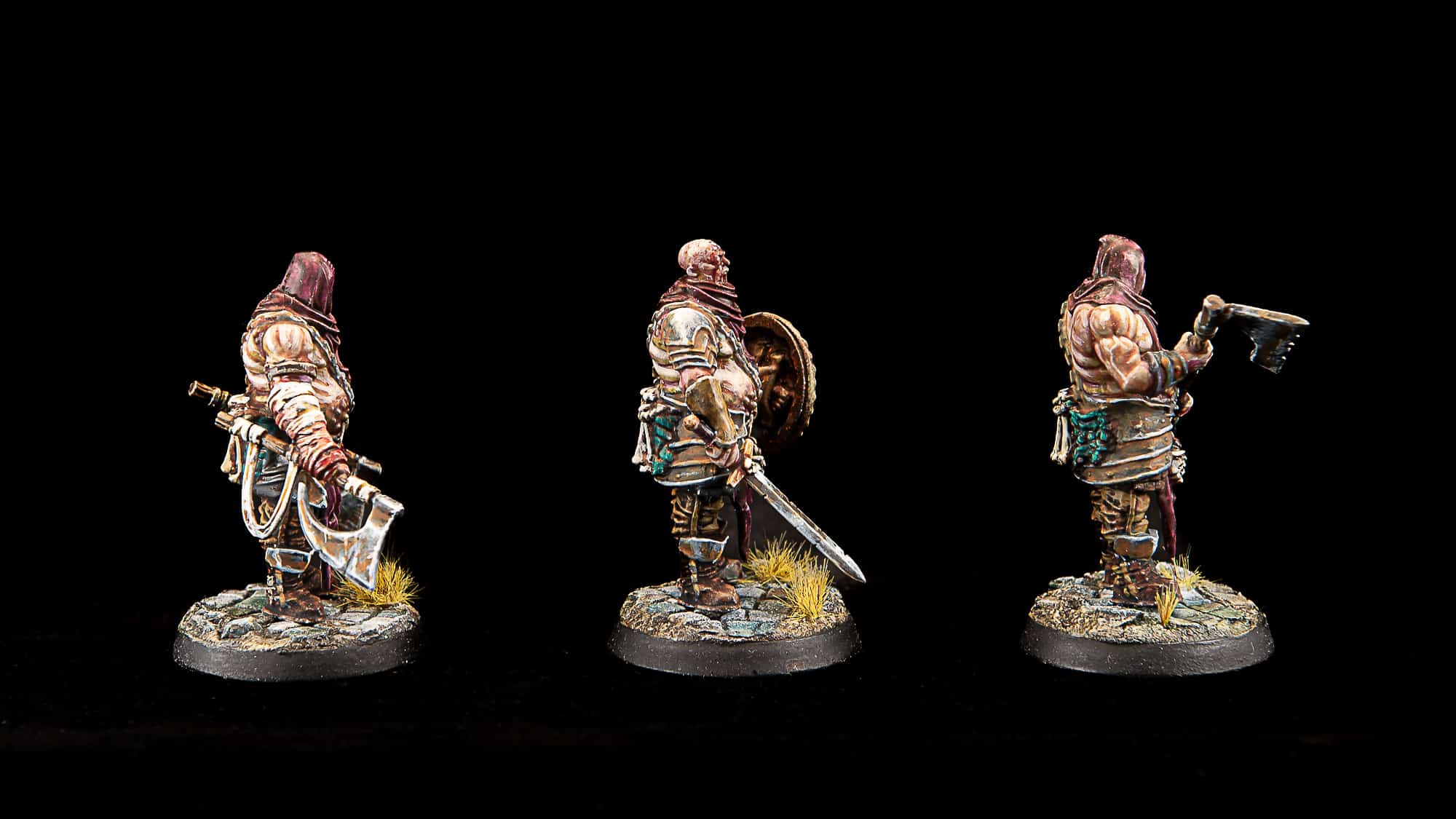 Pour terminer, celui du centre a vu son arme remplacée par une épée plus simple et son bouclier par un tirage résine issu du moulage d’un bouton de couture. Le bouclier du kit a deux gros défauts selon moi : il est trop grand et trop couvrant d’une part, possède bien trop de détails et de sculpture d’autre part. Je préfère largement de la simplicité ici.